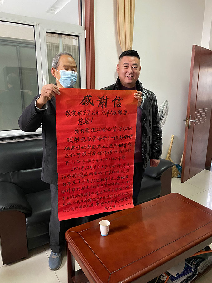 12月9日上午,東營(yíng)市公交公司汽車六隊(duì)的辦公樓里來(lái)了兩位手捧大紅色感謝信的老人家。上面寫著“感謝您教育培養(yǎng)了一位好師傅,他熱情地幫助并找回了遺失的背包?!?br/> 原來(lái),在12月8日上午,家住西城的吳女士和老伴從墾利區(qū)返程時(shí)乘坐了袁永文師傅駕駛的117路公交車,在到達(dá)濟(jì)南路附近下車后,發(fā)現(xiàn)自己的隨身斜跨的背包不見了。這時(shí)才想到可能是遺落在剛剛的公交車上,“雖然是個(gè)小破包,里面也就一百來(lái)塊錢,可是手機(jī)、鑰匙、老年卡都在包里。”回想起當(dāng)時(shí)發(fā)現(xiàn)背包丟失后的吳女士非常著急,“手機(jī)還是孩子剛給買的,還新得很呢”。焦急的吳女士便跑到附近的濱海派出所去詢問(wèn)該如何,“人家給我出了個(gè)主意,打上出租車去追”。吳女士和老伴便急忙攔上了一輛出租車去追趕。吳女士說(shuō)自己老伴平時(shí)出門也不帶電話,幸虧出租車駕駛員人也很好,用自己的電話撥打了吳女士背包里的手機(jī)。當(dāng)時(shí)還在駕駛車輛的袁永文師傅并不知道這一切,當(dāng)他聽到車廂內(nèi)有電話聲響,經(jīng)乘客提醒得知有個(gè)背包在座位上,考慮到可能是失主在尋找。袁師傅便在下一站把車??柯愤吅螅瑥陌锬贸鲭娫?,撥了回去,這樣雙方才取得了聯(lián)系。