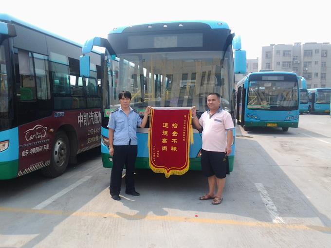2013年8月15日,在東營(yíng)市公路局工作的石忠軍師傅為公交駕駛員李長(zhǎng)征送來(lái)了一面“拾金不昧、品德高尚”的錦旗表示感謝。