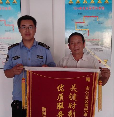 2012年8月16日,勝利油田長龍橡塑有限責任公司辦公室田主任拿著一面寫有“關鍵時刻見真情 優(yōu)質服務品德高”的錦旗來到市公交公司汽車一隊,感謝車隊寧學峰師傅的高尚品德。