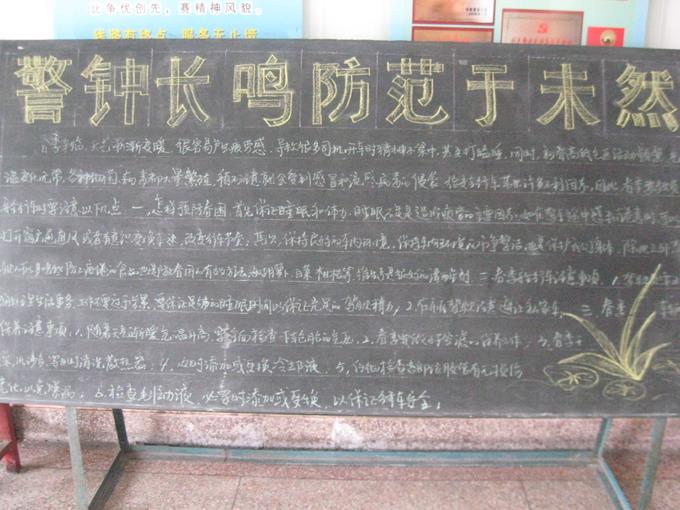 陽(yáng)春三月,氣溫回升,是讓人感覺最舒服的季節(jié),但由于季節(jié)交換,白天變長(zhǎng),人容易出現(xiàn)“春困”現(xiàn)象,尤其是對(duì)駕駛員來(lái)說(shuō),受“春困”影響更大,針對(duì)春困現(xiàn)象,汽車三隊(duì)一邊做好安全叮囑,要求廣大駕駛員注意行車安全,還專門出了一期黑板報(bào),詳細(xì)講解了春季行車注意事項(xiàng),同時(shí)提醒廣大駕駛員晚上要少熬夜,保證足夠的睡眠,中午要盡可能的休息一會(huì),把“春困”影響降低到最小,確保日常行車安全。