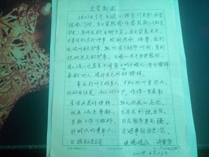 2018年6月24日上午,許女士拿著一件表?yè)P(yáng)稿來(lái)到市公交公司汽車一隊(duì),表?yè)P(yáng)121路駕駛員李團(tuán)兵師傅救助發(fā)病女乘客事跡。經(jīng)車隊(duì)了解得知,6月23日16:00時(shí)左右,汽車一隊(duì)駕駛員李團(tuán)兵駕駛魯E81658號(hào)車執(zhí)行火車站至公交公司的121路任務(wù)行經(jīng)區(qū)政府站點(diǎn)和理想之城站點(diǎn)間,車上有乘客告訴他,有人發(fā)生呼吸困難狀況。李團(tuán)兵趕緊將車停好,離開(kāi)駕駛座,發(fā)現(xiàn)一位女乘客發(fā)燒、臉色蒼白,然后給她送水,并打電話叫救護(hù)車。為了盡快讓該乘客得到救治,李團(tuán)兵與救護(hù)車上的工作人員說(shuō)明121路的運(yùn)行路線,然后駕駛車輛繼續(xù)行駛,在職業(yè)學(xué)院南門(mén)附近與救護(hù)車會(huì)合,把該乘客送上救護(hù)車。