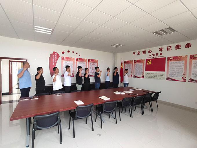 面對鮮紅的黨旗,五隊支部書記王健同志作為領(lǐng)誓人,帶領(lǐng)全體黨員一起高舉右手,再次莊嚴宣誓?!拔抑驹讣尤胫袊伯a(chǎn)黨……隨時準備為黨和人民犧牲一切,永不叛黨?!辩H鏘恢宏的誓詞,強烈震撼著在場的每一位黨員,一字一句,神圣而豪邁,體現(xiàn)了黨員同志們對中國共產(chǎn)黨的無限忠誠。