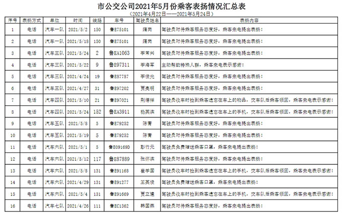 近段時間以來,東營公交廣大駕駛員在做好疫情防控的同時,積極投身公交服務質量提升工作。經過持續(xù)不斷的努力,公交服務質量明顯提高,涌現了一大批的好人好事,受到乘客的好評,大力營造了“比、學、趕、幫、超”的良好氛圍。 廣大駕駛員要以受到表揚的同志為榜樣,愛崗敬業(yè)、無私奉獻,為樹立和維護公司的外在形象作出貢獻。同時也希望受到表揚的同志戒驕戒躁,再接再厲,發(fā)揮模范作用,繼續(xù)為公司的服務提升工作貢獻力量。