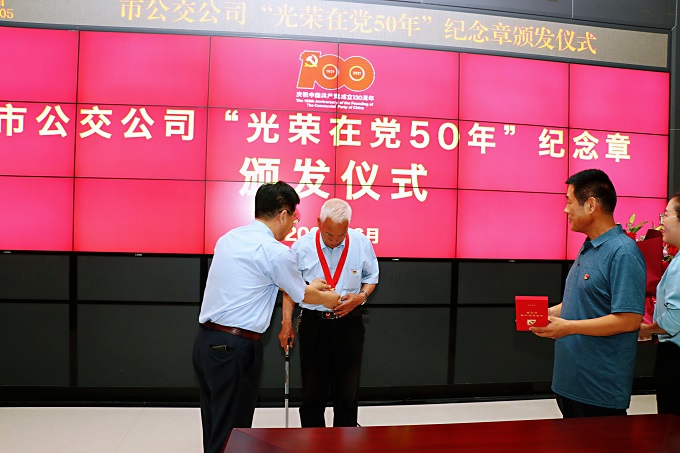 6月24日上午,在中國共產(chǎn)黨成立100周年即將到來之際,東營(yíng)公交組織開展了“光榮在黨50年”紀(jì)念章頒發(fā)儀式。公司黨委書記趙龍、經(jīng)理劉海、副經(jīng)理孫紅光、景洪培和黨齡50周年老黨員以及黨員代表等參加了頒發(fā)活動(dòng)。