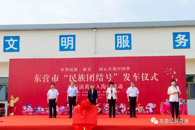 儀式現(xiàn)場,民族團(tuán)結(jié)號公交車整裝待發(fā),車身煥然一新,貼有“中華民族一家親、同心共筑中國夢”“各民族像石榴籽一樣緊緊擁抱雜一起”等字樣,融入東營民族團(tuán)結(jié)進(jìn)步“石榴籽”“石榴花開黃河口”等地域元素,生動展示了各民族群眾在黃河入??跀y手團(tuán)結(jié)奮斗、共創(chuàng)美好生活的故事,市公交公司黨委書記趙龍同志現(xiàn)場就民族團(tuán)結(jié)號公交車籌備情況作了匯報。市交通運(yùn)輸局黨組成員、市鐵路港航發(fā)展中心主任朱勝勇致辭,市人大常委會副主任張敏,市政協(xié)副主席王新明為東營市民族團(tuán)結(jié)號揭牌,市委常委、統(tǒng)戰(zhàn)部部長郭艷發(fā)表講話,并宣布東營市民族團(tuán)結(jié)號發(fā)車。
