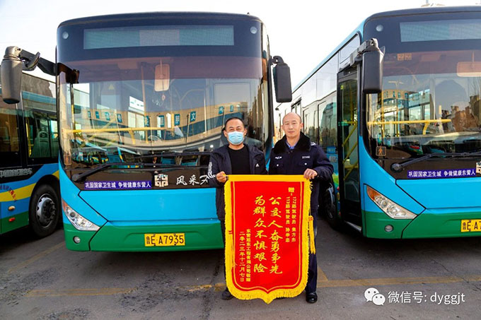 2023年12月8日,東營(yíng)旭東工程公司的代表來到東營(yíng)公交集團(tuán)汽車七隊(duì)贈(zèng)送一面錦旗,上面寫著“公交人奮勇爭(zhēng)先,為群眾不懼艱險(xiǎn)”的字樣。這時(shí)大家才知道,原來是兩位公交駕駛員見義勇為幫助他們滅了一輛正在自燃的小貨車。