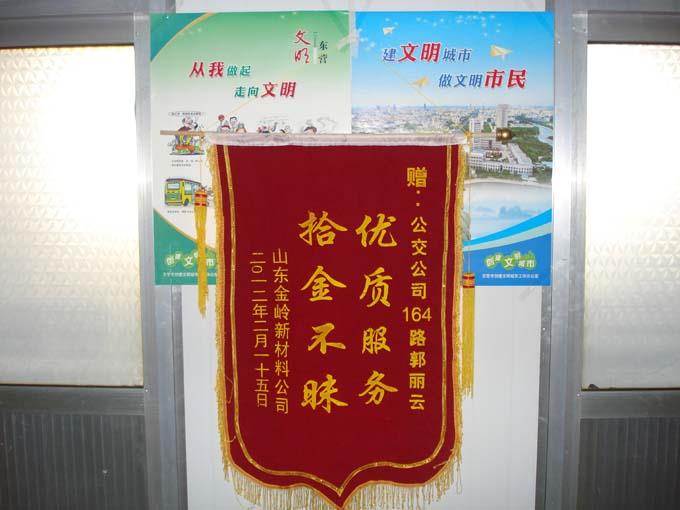 這位小伙子名叫燕同意,是山東金嶺新材料公司的一名職工,2012年2月15日上午,剛下了早班的燕同意乘坐8:40的164路返回東城,下車(chē)時(shí)將錢(qián)包落在了公交車(chē)上。跑回東城的駕駛員郭麗云在打掃車(chē)輛衛(wèi)生時(shí)看到了一個(gè)棕色的牛皮錢(qián)包,里面3000多元現(xiàn)金,4張銀行卡,1張銀聯(lián)卡,1張身份證。面對(duì)鼓鼓的錢(qián)包,郭麗云第一時(shí)間將錢(qián)包交到了車(chē)隊(duì)。并與車(chē)隊(duì)工作人員一起通過(guò)包內(nèi)的卡片多方聯(lián)系,在短短不到半個(gè)小時(shí)內(nèi)便將錢(qián)包送到了失主的手中。小燕問(wèn)駕駛員名字,郭麗云卻怎么也不肯告訴他。小燕通過(guò)多方打聽(tīng)才知道了她的姓名。時(shí)隔多日,小燕帶著感激的心情送來(lái)了一面寫(xiě)有“優(yōu)質(zhì)服務(wù)、拾金不昧”的錦旗。