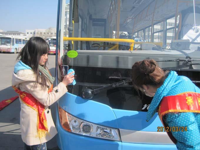 來自東營市職業(yè)學(xué)院經(jīng)濟(jì)系的大學(xué)生和汽車一隊(duì)職工共計(jì)32人,分成兩個(gè)小組,一組乘坐公交車上路為特需乘客服務(wù),幫助疏導(dǎo)乘客;一組幫助駕駛員擦拭車身,清掃車廂衛(wèi)生。大家工作起來井然有序,有條不紊,尤其活躍在車廂為乘客服務(wù)的志愿者們,更是得到了乘客的一致好評,成為公交車上一道亮麗的風(fēng)景。